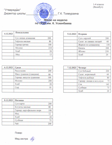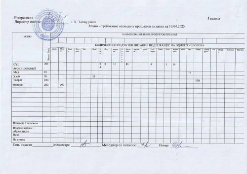Мәзір-10.03.2023 азық-түлік өнімдерін беруге қойылатын талап