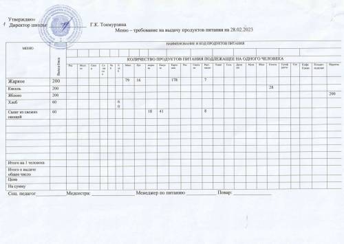 Мәзір-28.02.2023 азық-түлік өнімдерін беруге қойылатын талап