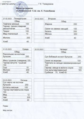 Мәзір-24.02.2023 ж. азық-түлік өнімдерін беруге қойылатын талап