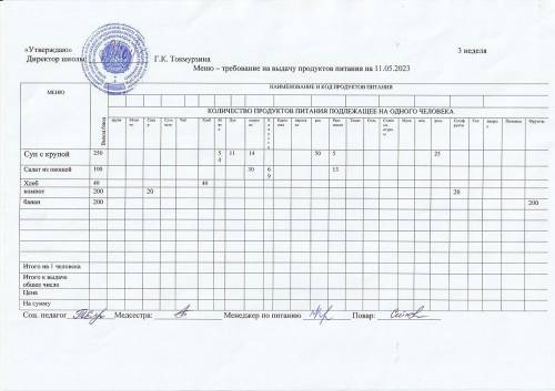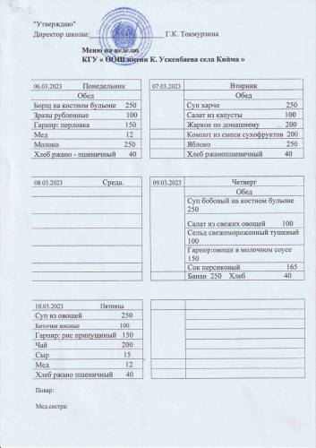 Мәзір-06.03.2023 ж. азық-түлік өнімдерін беруге қойылатын талап