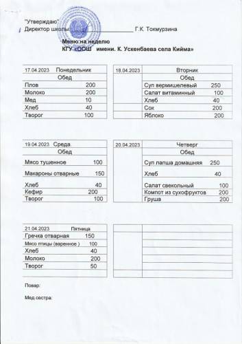 Мәзір-17.02.2023 ж. азық-түлік өнімдерін беруге қойылатын талап